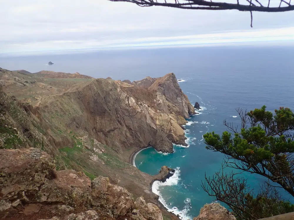 A vereda sobe de forma gradual até ao Pico Branco, o segundo ponto mais alto da ilha, com 450 metros de altitude. O número pode impressionar, mas o trilho está bem cuidado e é acessível para quem tenha uma condição física razoável. No cimo, és recebido por uma vista de 360 graus de cortar a respiração: o Atlântico a perder de vista e as colinas e vales de Porto Santo a estenderem-se sob os teus pés. É o tipo de paisagem que faz qualquer um pousar o telemóvel e simplesmente apreciar o momento.